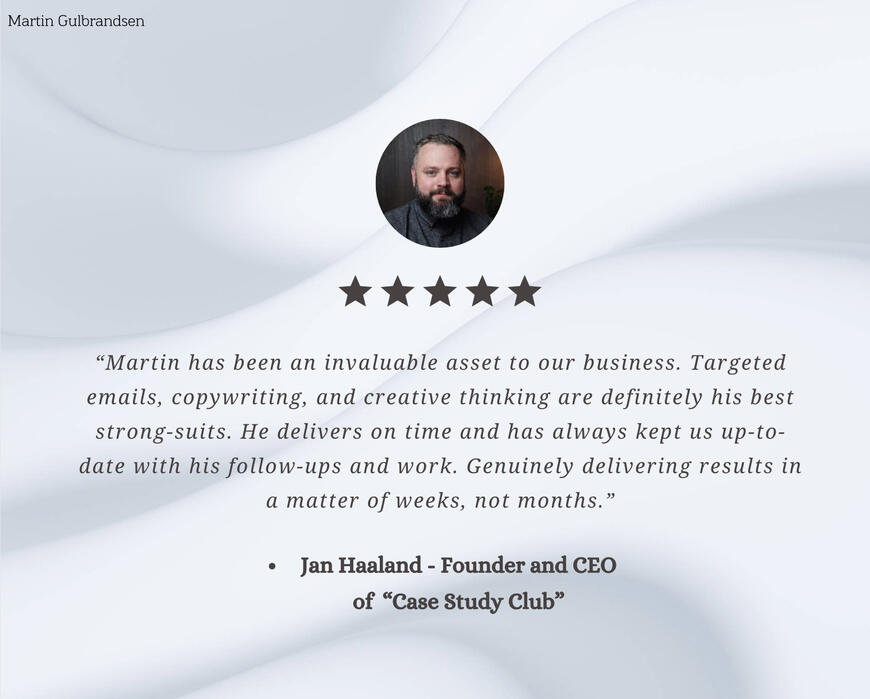 Hi, my name is Martin Gulbrandsen. I'm a strategic growth partner for your business, NOT a copywriter trading words for money.(More on that below)- Based in Kristiansand, Norway